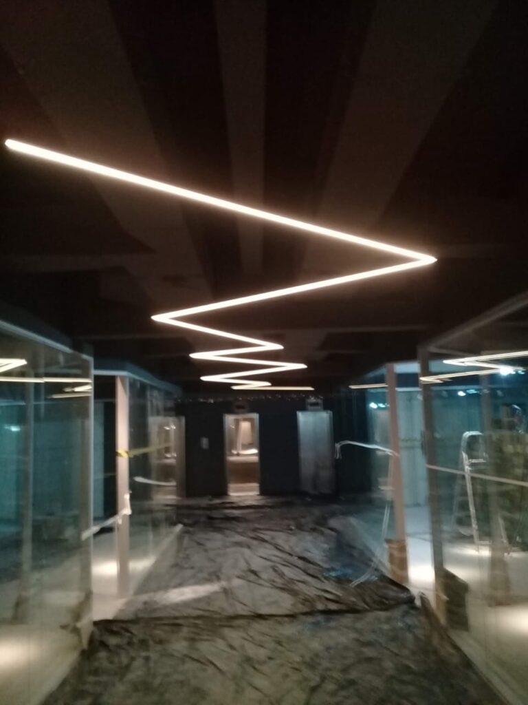 Aplicação de spots e luminárias embutidas, com corte perfeito e alinhamento impecável no teto.